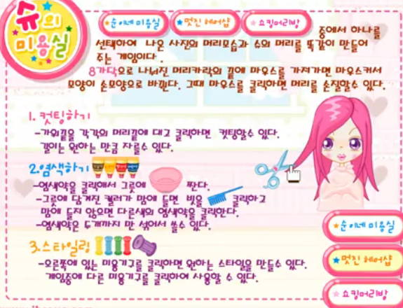 개인적으로 제가 시간 날 때마다 즐겨하는 슈의 미용실이라고 하는 추억의 아이브라보 슈게임하기를 지금 여러분들도 위에서 즐겨보세요.
