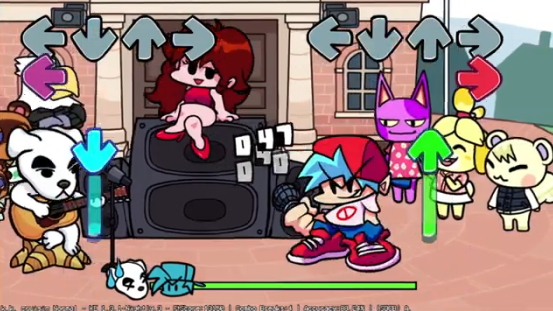 당신이 상대를 해야 하는 캐릭터의 경우에는 깜찍한 강아지와 배틀을 진행을 하게 됩니다. 뒤에서는 친구들이 웃음을 지으면서 응원을 하고 있는데 강아지 빌런 녀석은 기타를 사용을 하고 노래를 부르면서 당신에게 리듬 도발을 하게 되는데 아무리 귀여운 외모라고 해도 바주지 마시고 정확하게 키보드 방향키를 입력을 해서 완벽하게 제압을 해줘야 하겠습니다.
